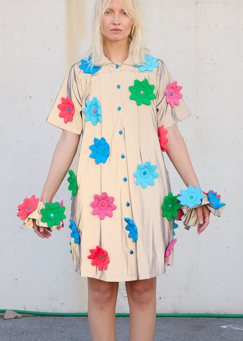 This reflective fabric completely changes in light. Wear it as a wrist cuff, scrunchie, or even a dog collar for your pup! Constructed with 100% nylon. Remove or move around the flowers, they all snap on!